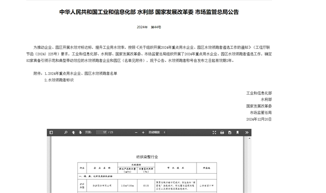 導讀:日前,國家工信部、水利部、發(fā)展改革委、市場監(jiān)管總局等四部門聯(lián)合公示了“2024年重點用水企業(yè)、園區(qū)水效領跑者名單”,公司成功入選國家級重點企業(yè)水效領跑者