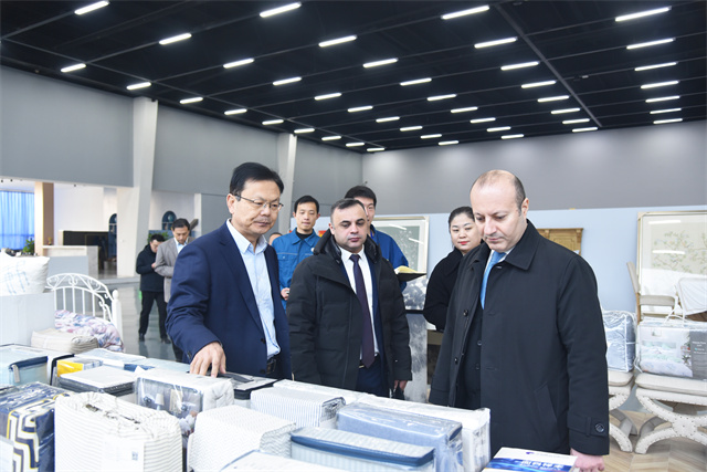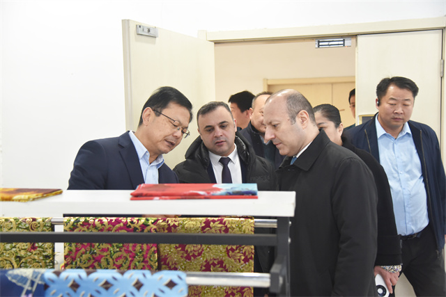 特穆爾·納迪羅格魯公使一行參觀了公司智云中心、檢測(cè)中心、綜合辦公區(qū)、服裝面料公司、花布公司、家紡公司、創(chuàng)意中心、研究院、花布車間、面料車間、家紡車間、家紡成品車間、服裝車間等區(qū)域,高度贊賞了公司在科技創(chuàng)新、環(huán)保實(shí)踐、產(chǎn)品多元化、產(chǎn)業(yè)布局等方面的成就。